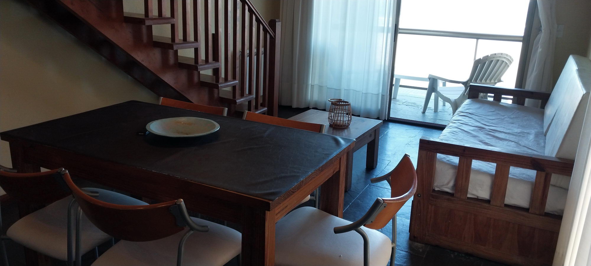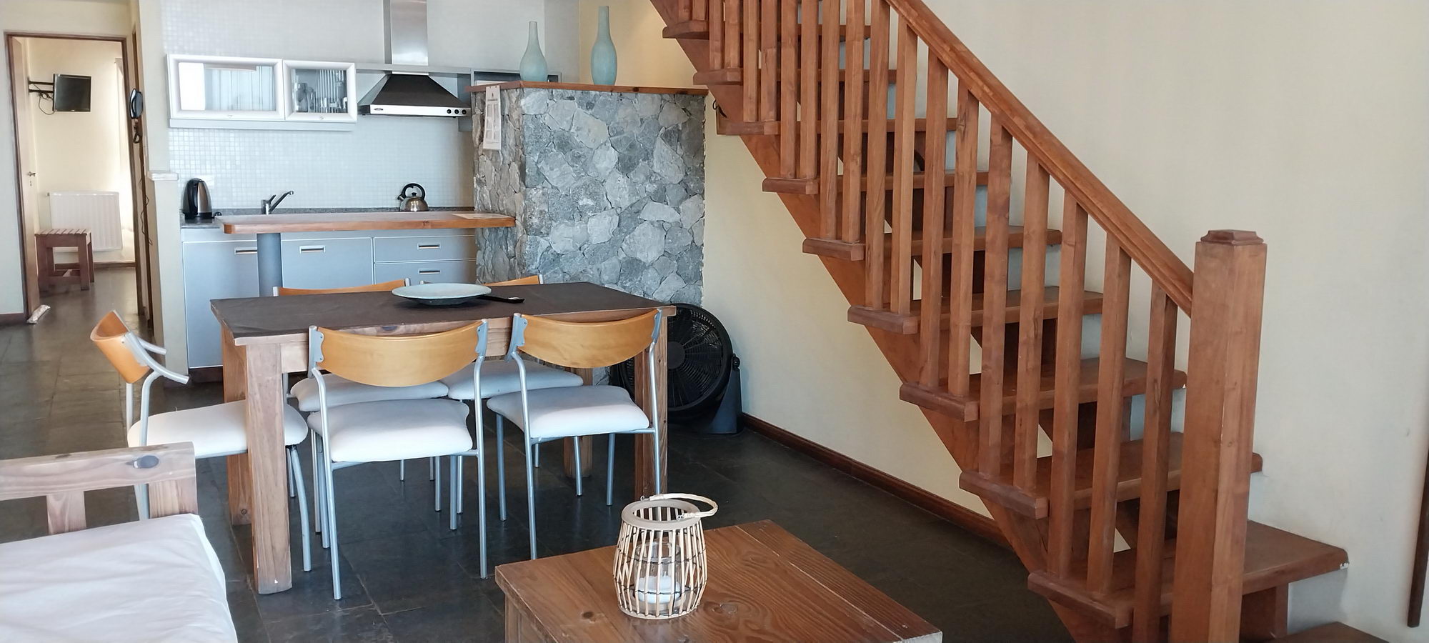 El complejo cuenta con 2 unidades de 65 m2 para 5 personas, ubicadas en primer piso y distribuidas en dos plantas. Planta baja: amplio ventanal con vista al mar, sofá cama con cajonera, mesa ratona, TV de 32 pulgadas, mesa para cinco personas y barra desayunadora.