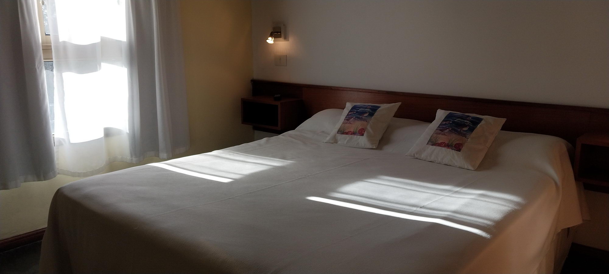Planta alta: dormitorio abierto balconeando al living, con dos sommiers simples que pueden unirse para formar una cama matrimonial, cómoda, TV de 32 pulgadas, ventilador turbo y ventana al exterior.