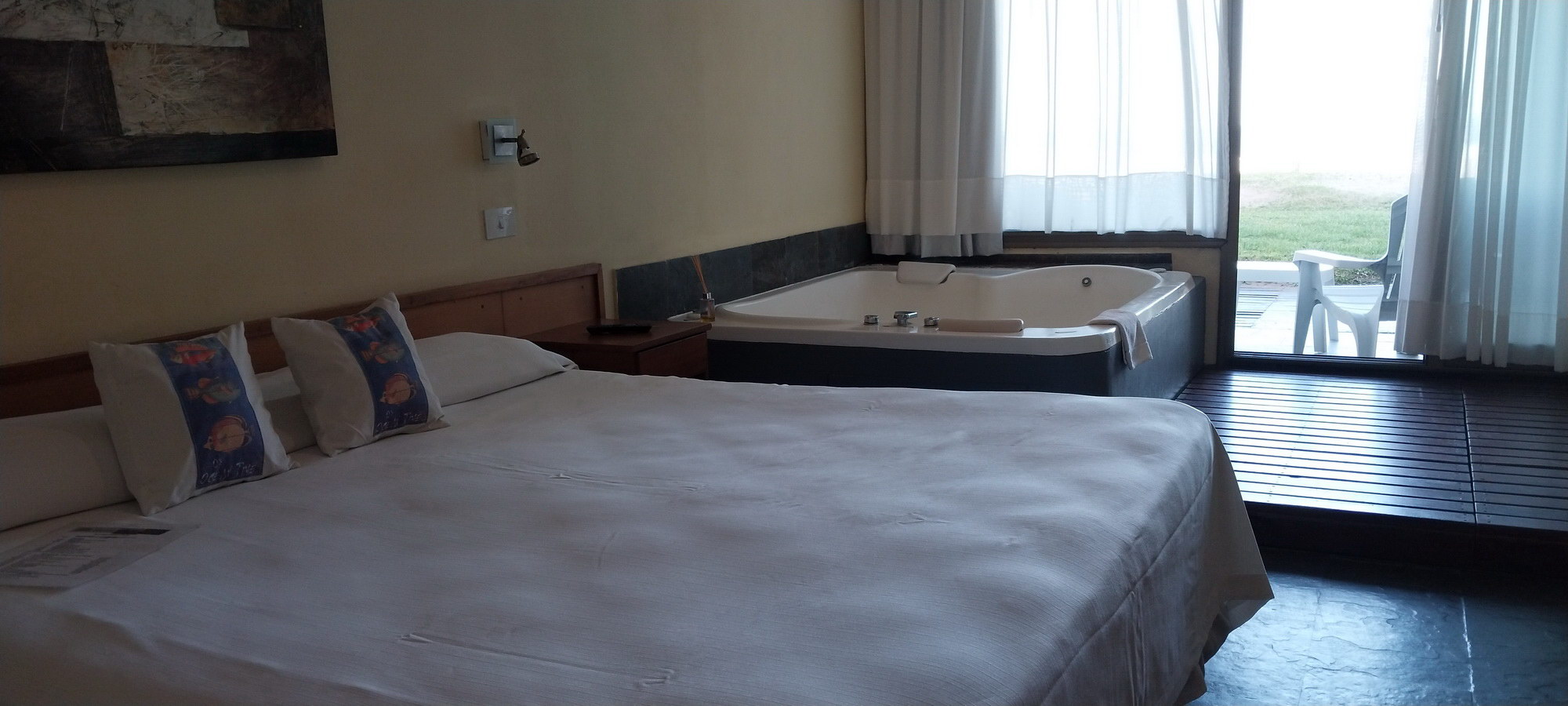 Todas se destacan por su jacuzzi doble con vista al mar, ubicado junto a un gran ventanal. Sommier doble extra king size, dos mesas de luz a ambos lados, TV de 32 pulgadas y placard con cofre de seguridad al frente. Ventilador de techo.